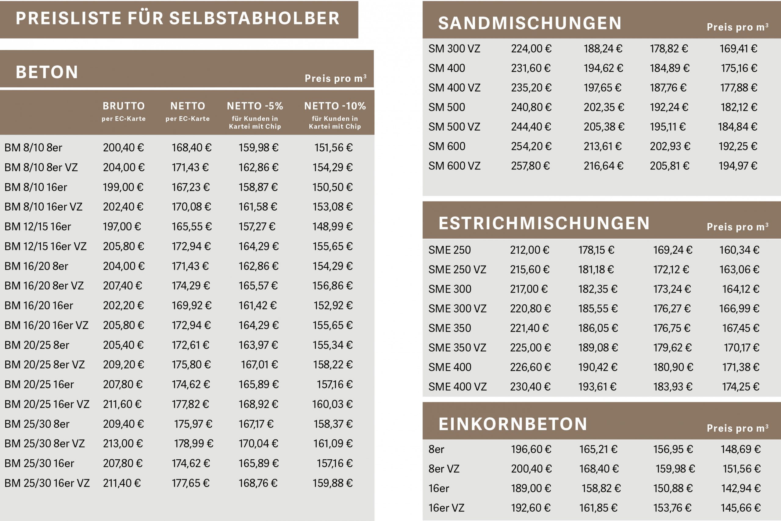 (Die angebotenen Betonsorten sowie die Preise können Sie hier unserer aktuellen Preisliste entnehmen.)